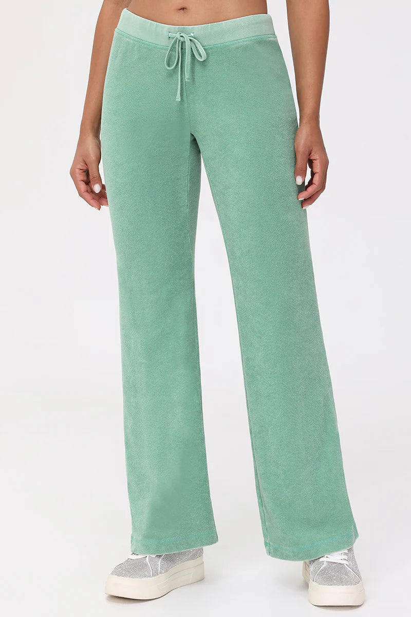 The perfect canvas, we've once again reinvented our essential track pant in washed towel terry. Finished with a drawstring elastic waistband and our iconic rhinestone logo. Say goodbye to pesky sand and hello to beach-chic style!