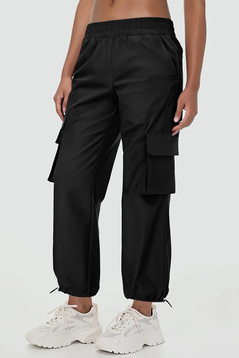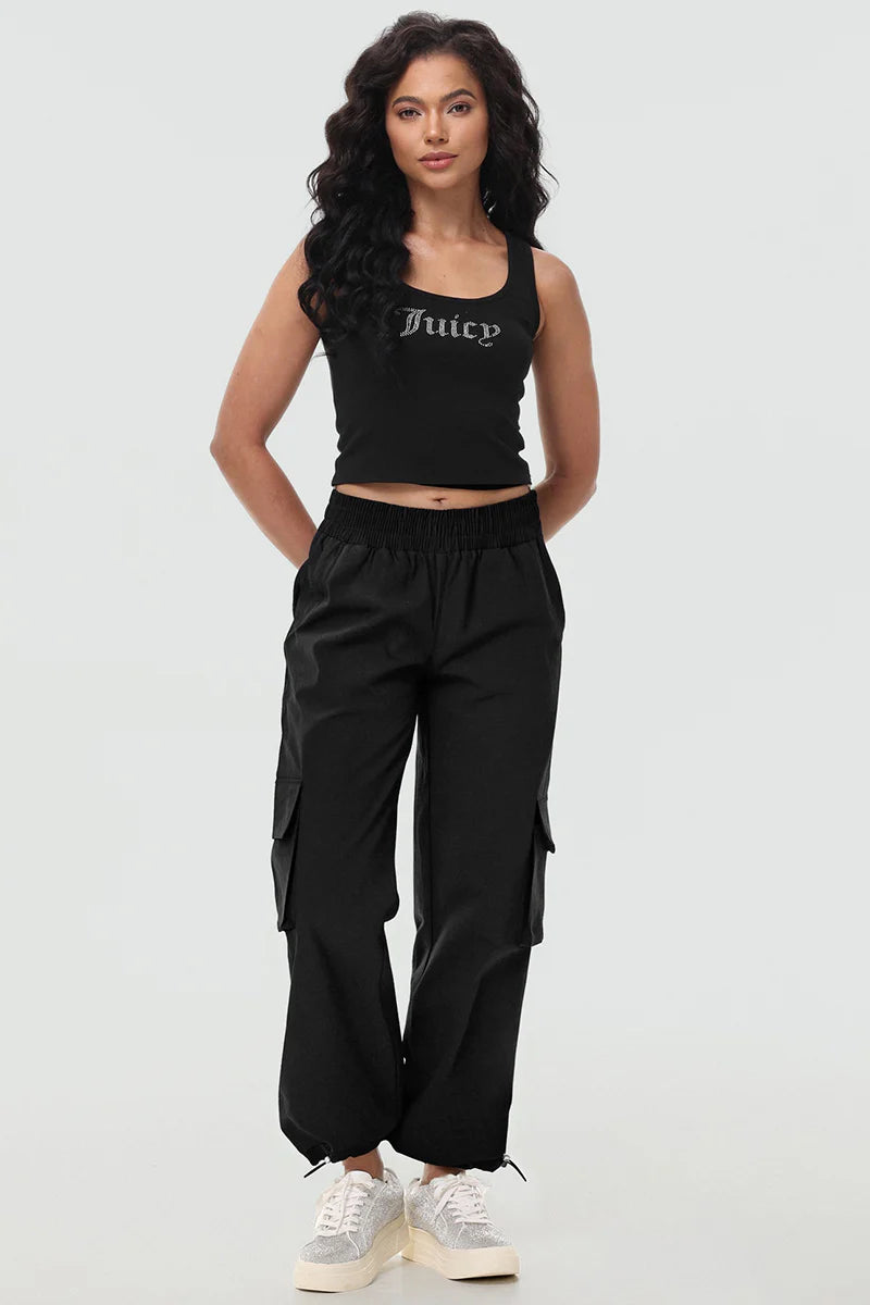 Crafted from a smooth and lightweight woven fabric with a bedazzled logo on the back, these utility-inspired pants flawlessly fuse functionality and fashion.