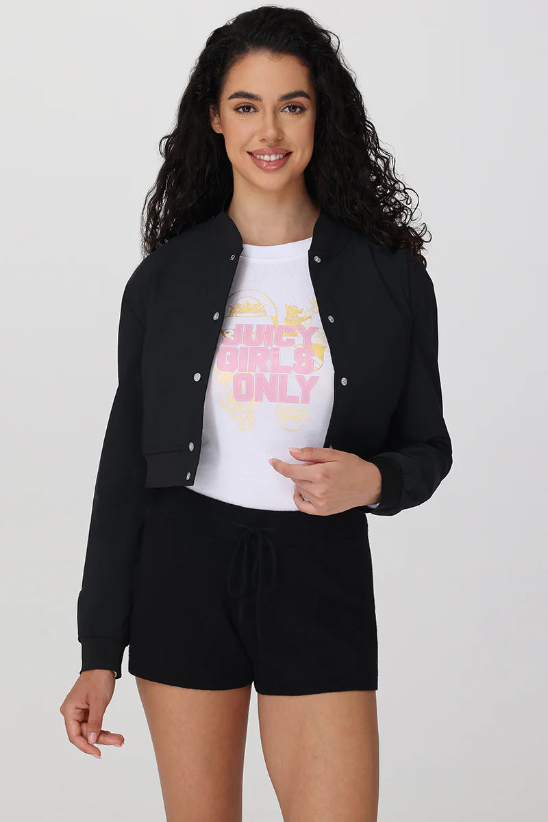 Put a varsity spin on Juicy with this cropped bomber jacket complete with vintage-inspired appliqué lettering on...