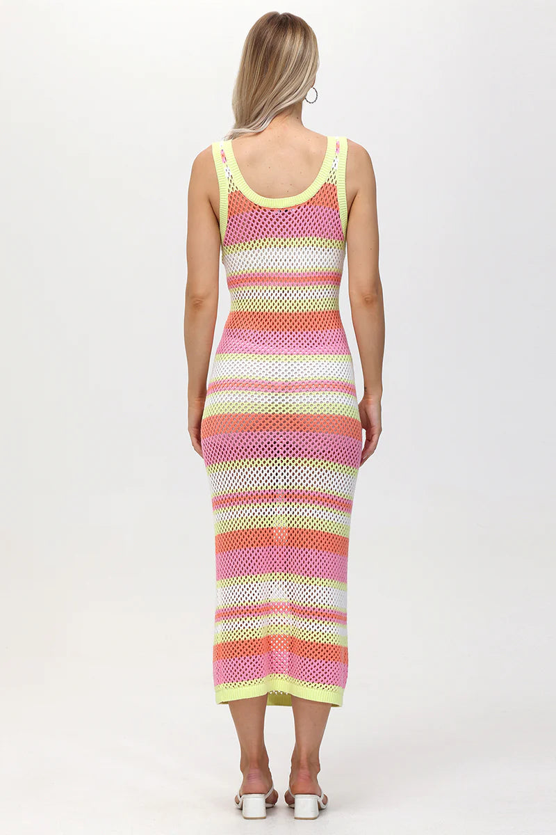 Airy crochet stitching textures this vacation-ready dress with a colorful hem.