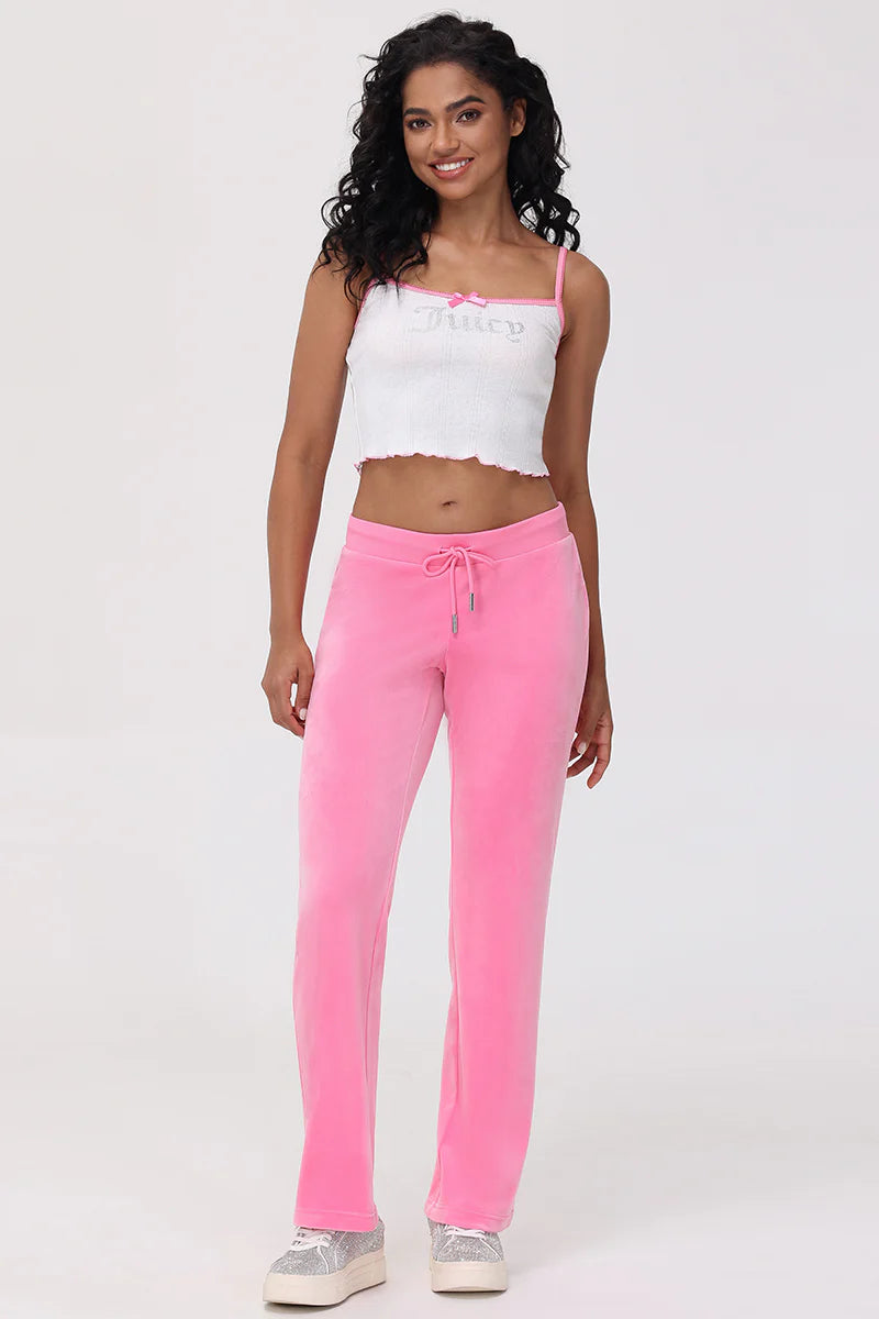 Delicate pointelle stitching defines a soft cotton cami that features a crimped lettuce edge and Juicy rhinestone...