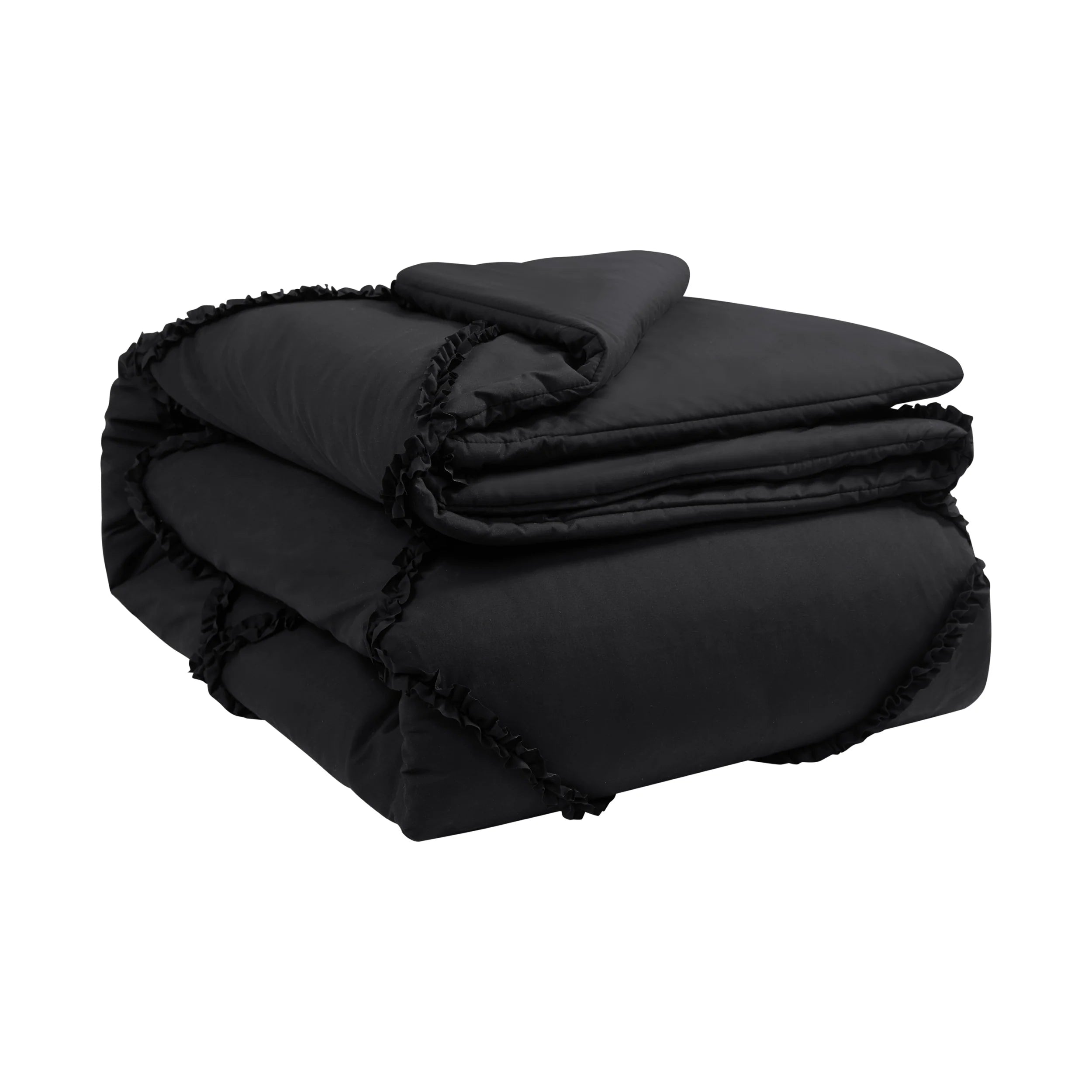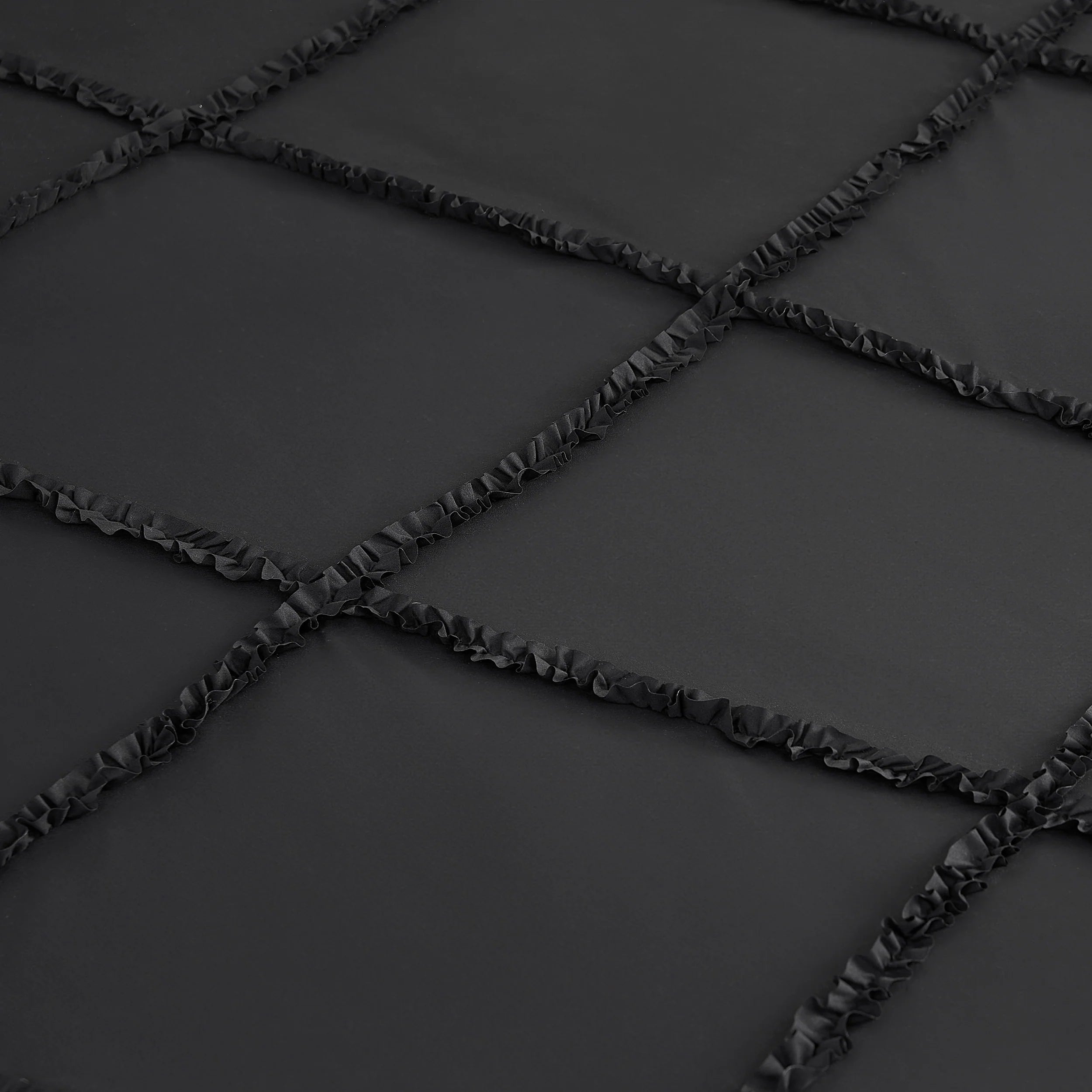 Make a statement with the Juicy Couture Diamond Ruffle reversible comforter set. Stylish ruffle detailing in a diamond pattern with a bold black-on-black design. The reverse side features a sumptuously soft plush microfiber.