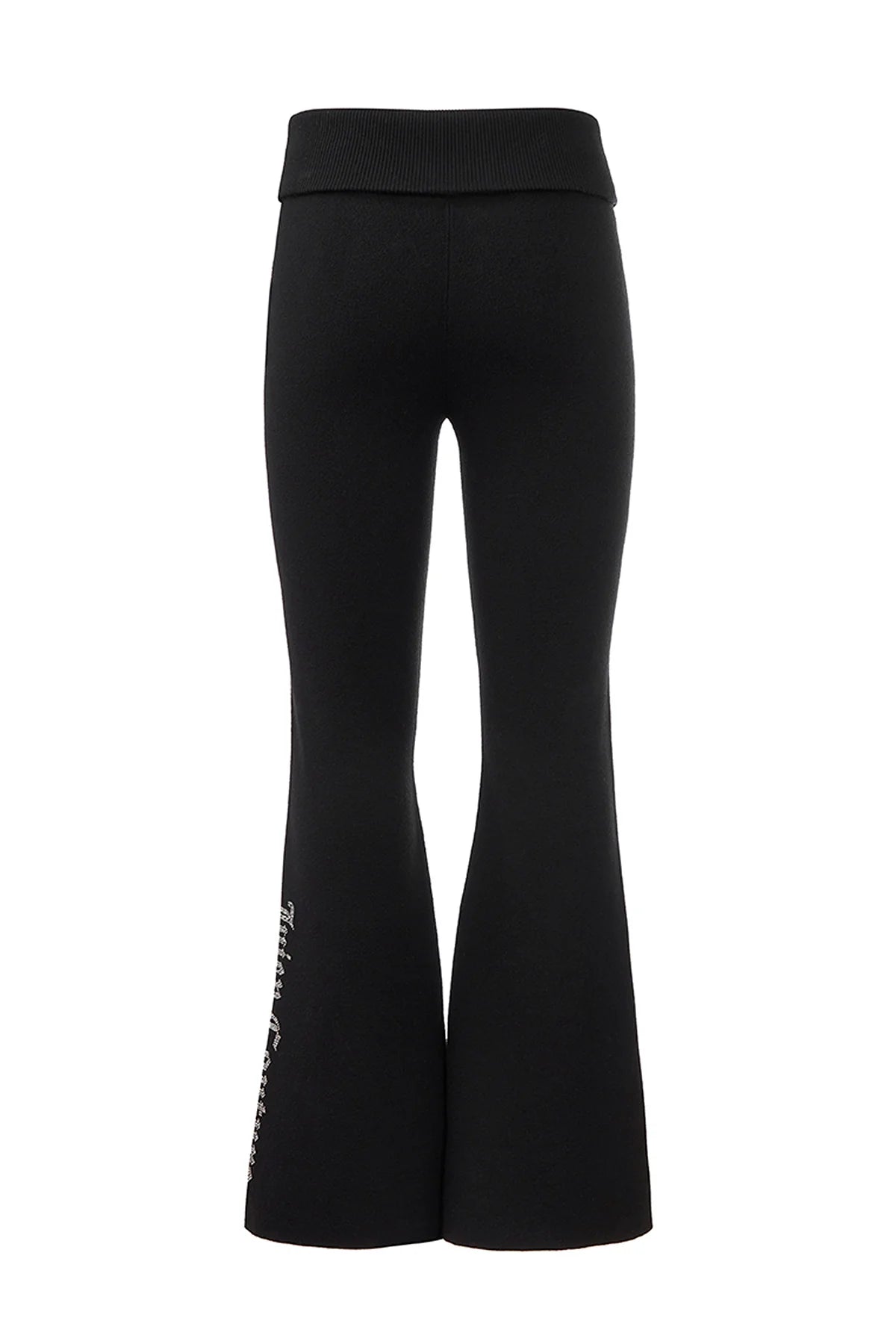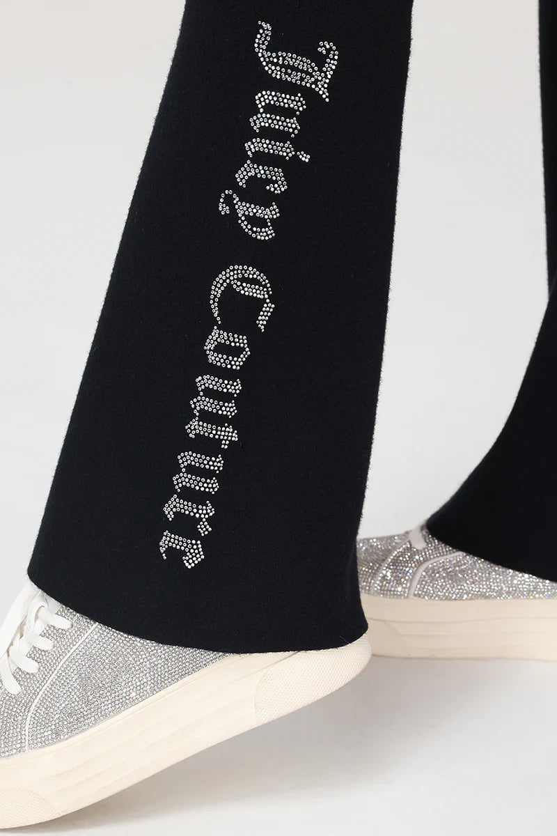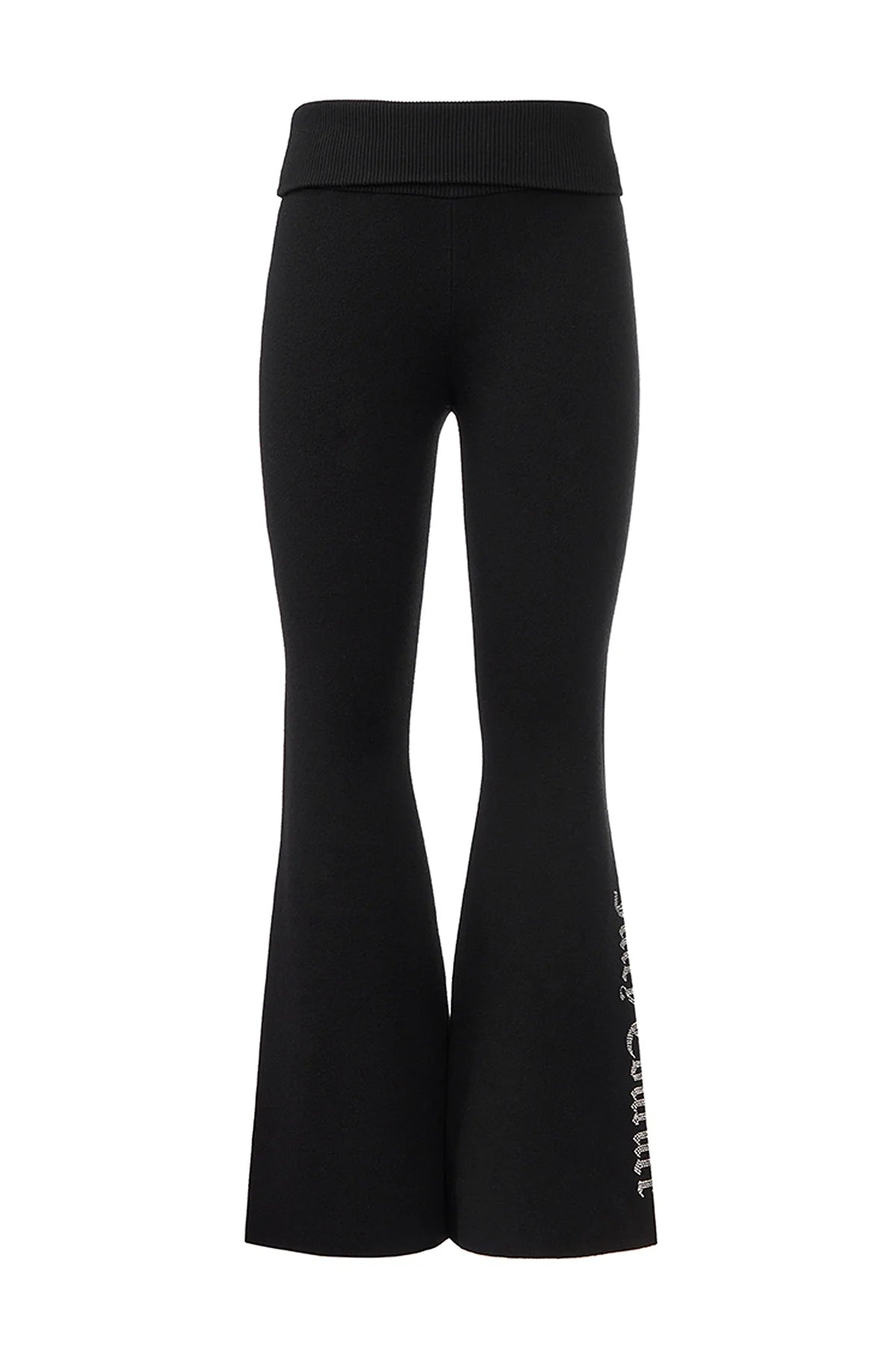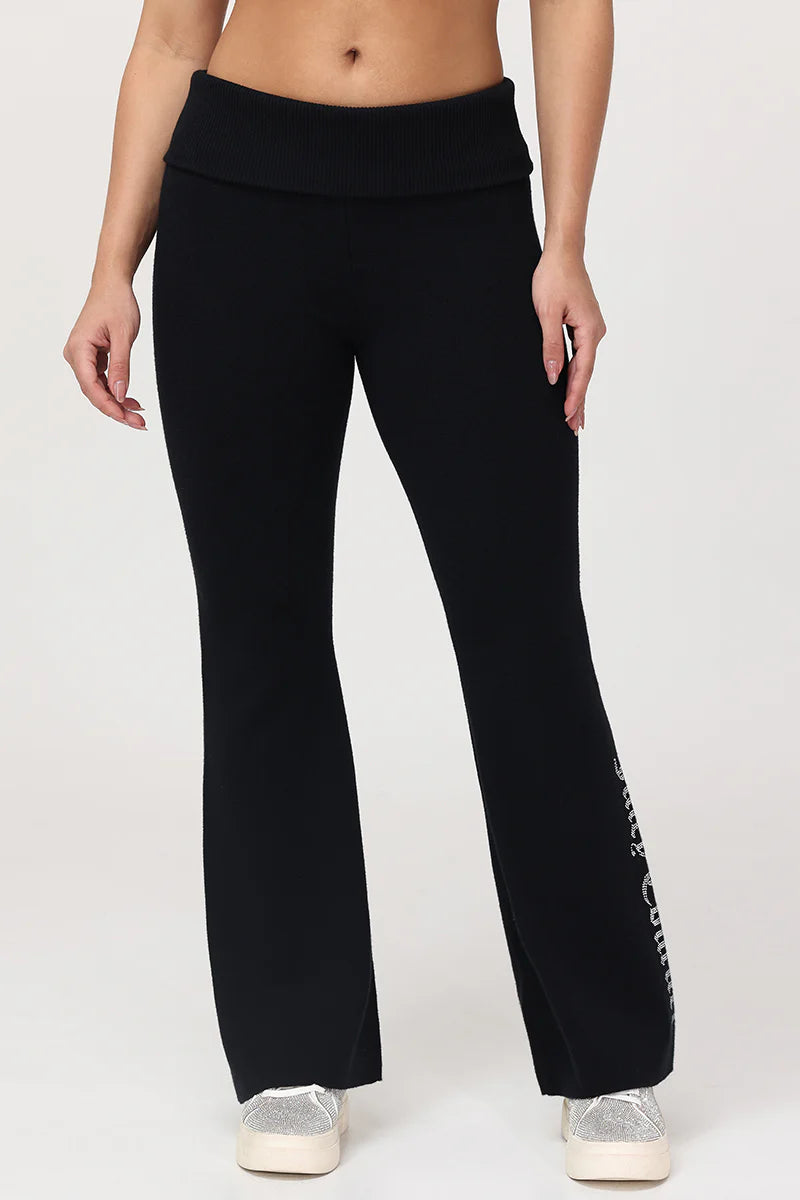 A Y2K classic with a comfy twist. These warm and endlessly wearable knit flare pants feature a low rise, fold-over waist, and a small rhinestone logo on the side of leg.
