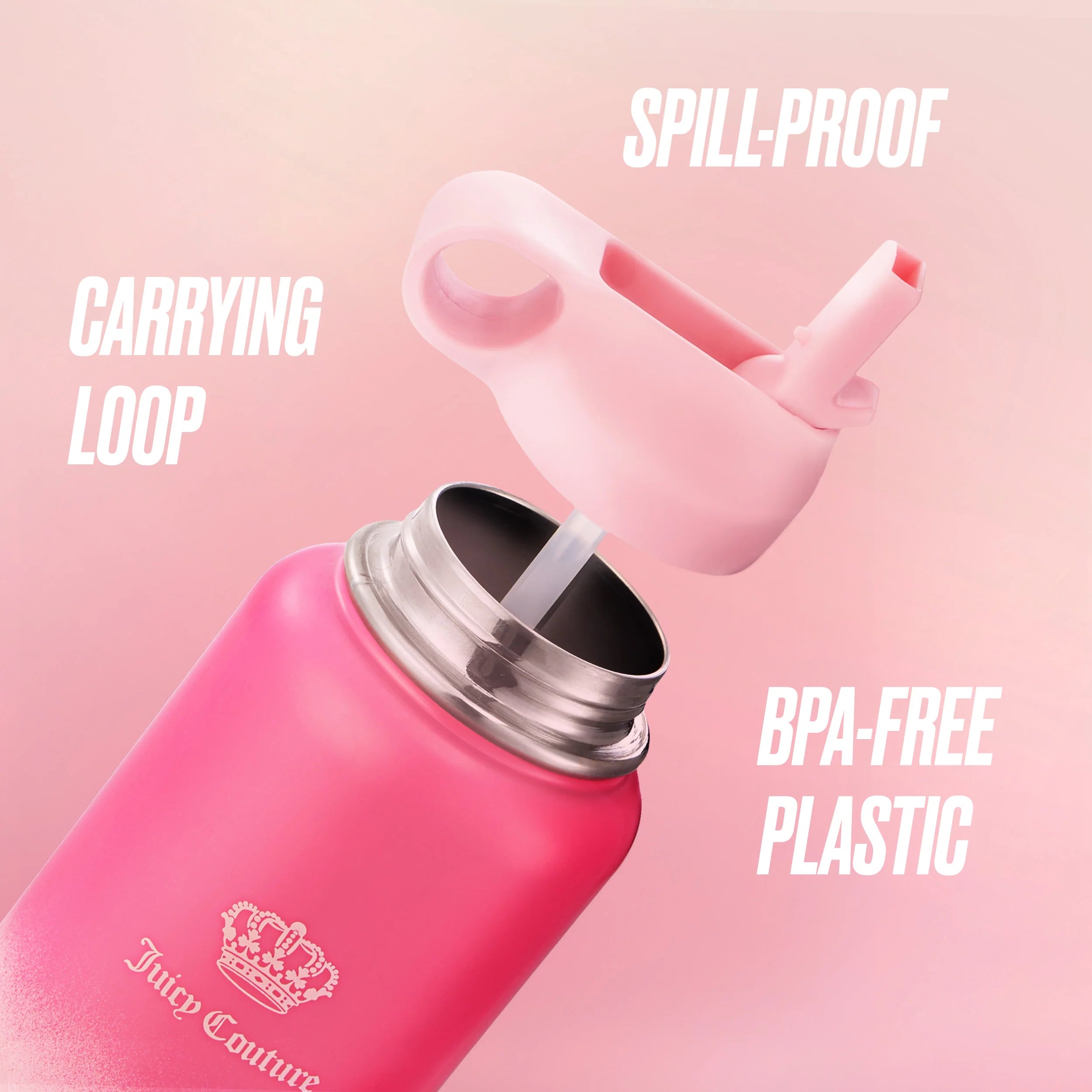 Elevate your hydration game with this 32 oz water bottle. Crafted from double wall stainless steel, this contemporary water container features a vibrant two-tone ombre design for added Juicy glam to your everyday water bottle. Featuring a spill-proof flip-top lid and curved straw—it's the ultimate in fashion and function