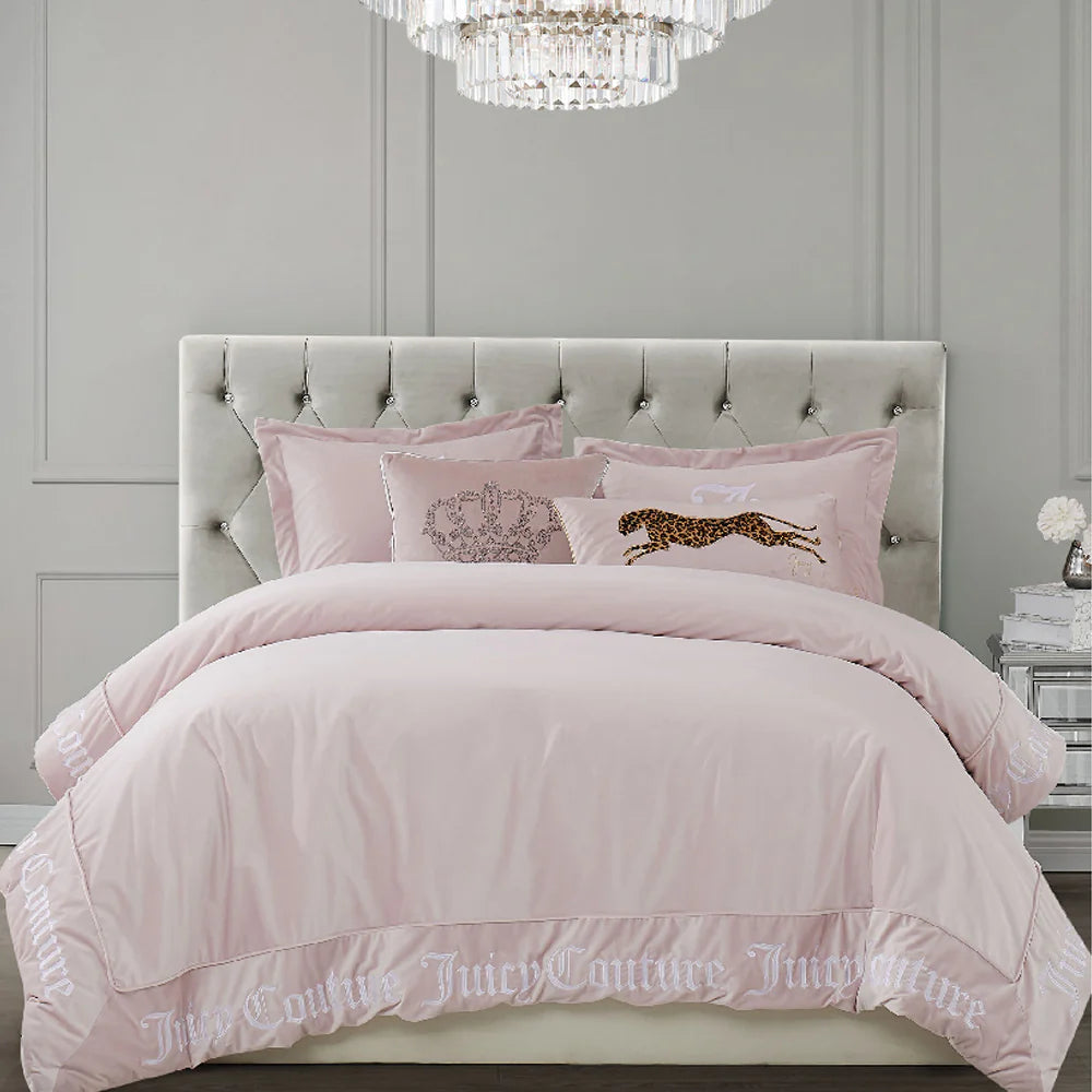 Transform your bedroom with the laidback glam of the Juicy Couture Velvet Gothic Comforter Set. This set features plush light pink velvet accented with the Juicy Couture logo in white embroidered gothic letters €“ a perfect fusion of hard and soft.