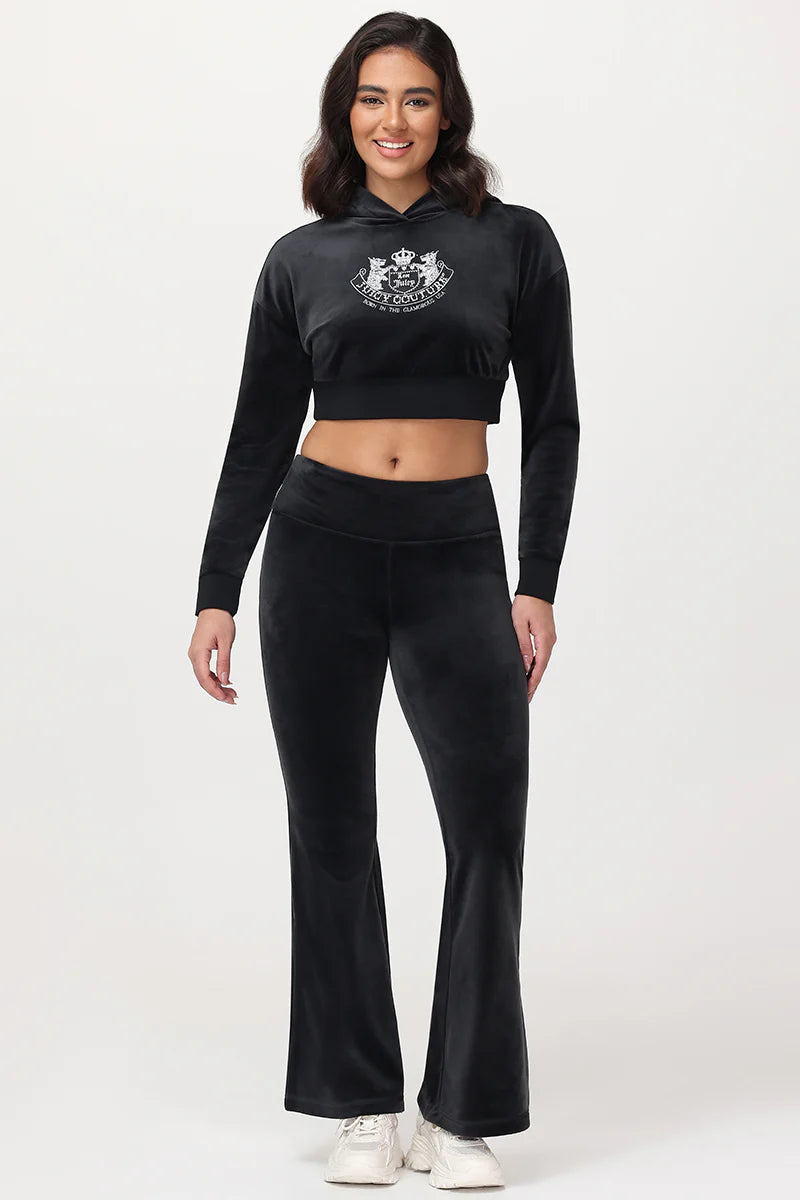 Slip into signature Juicy style with these luxe velour flare pants, featuring a dazzling rhinestone JUICY logo across the back. Soft, statement-making, and full of attitude. Pair with a matching hoodie for the ultimate throwback glam.
