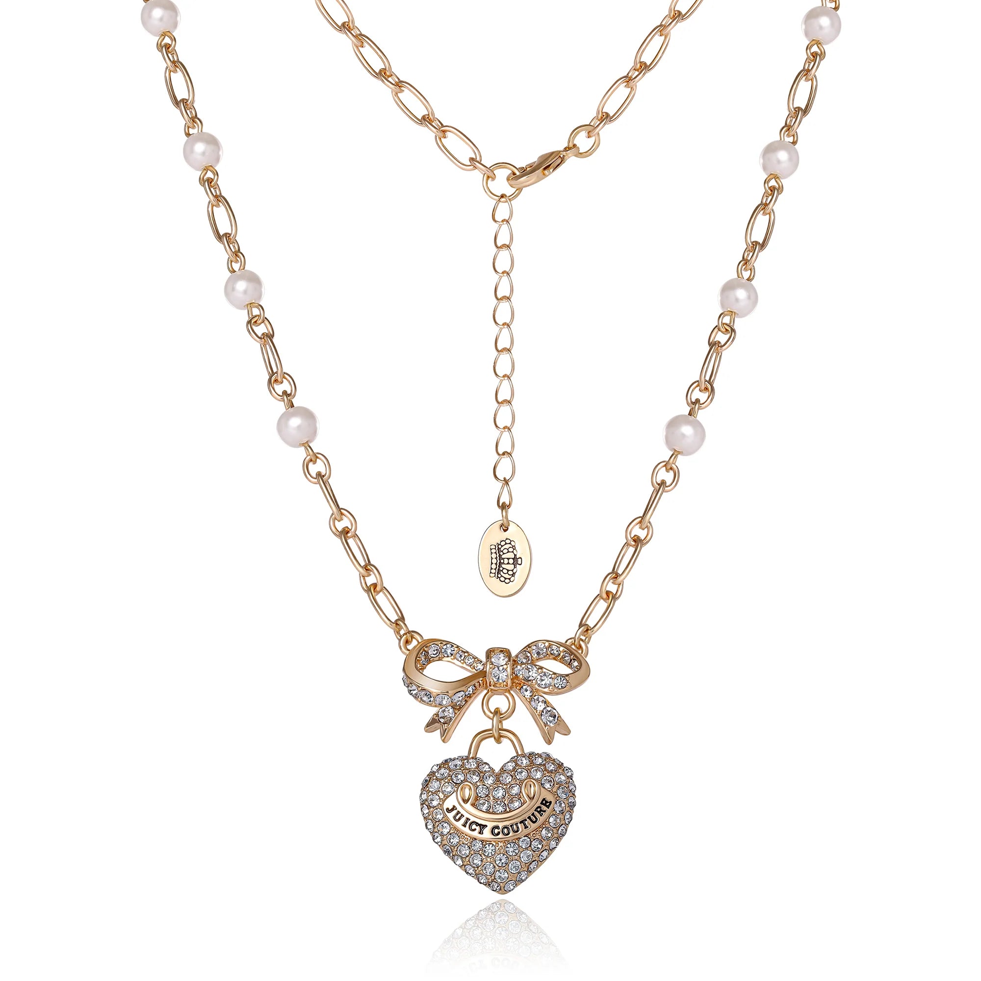 Elevate your elegance with the Juicy Couture Goldtone Pearl Heart Pendant Necklace. This stunning piece features delicate pearl accents along a chic Goldtone chain, with a sparkling heart pendant adorned with crystal embellishments and a dainty bow. Whether worn alone or layered, this necklace adds a timeless and glamorous touch to any outfit. Perfect for special occasions or everyday luxury.
