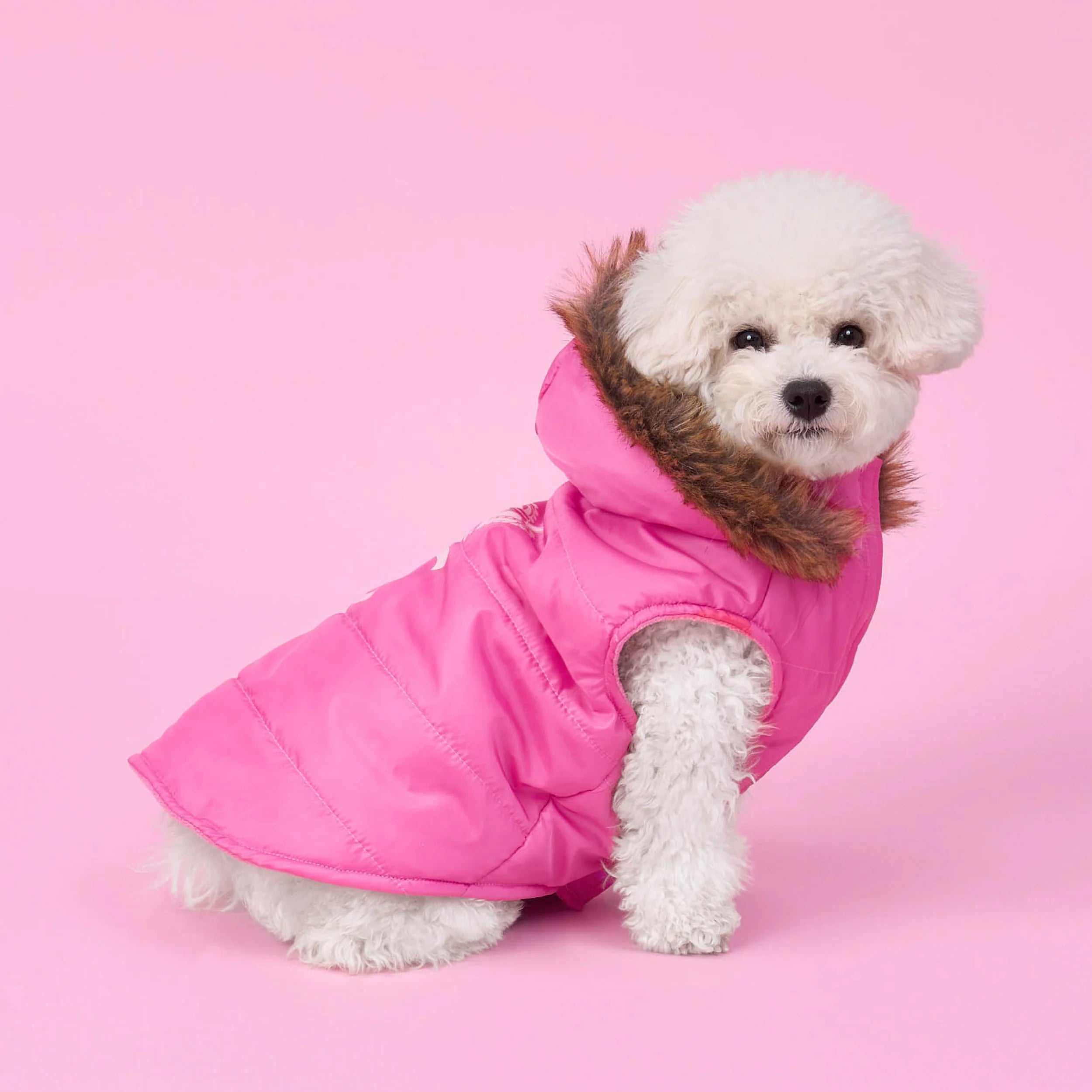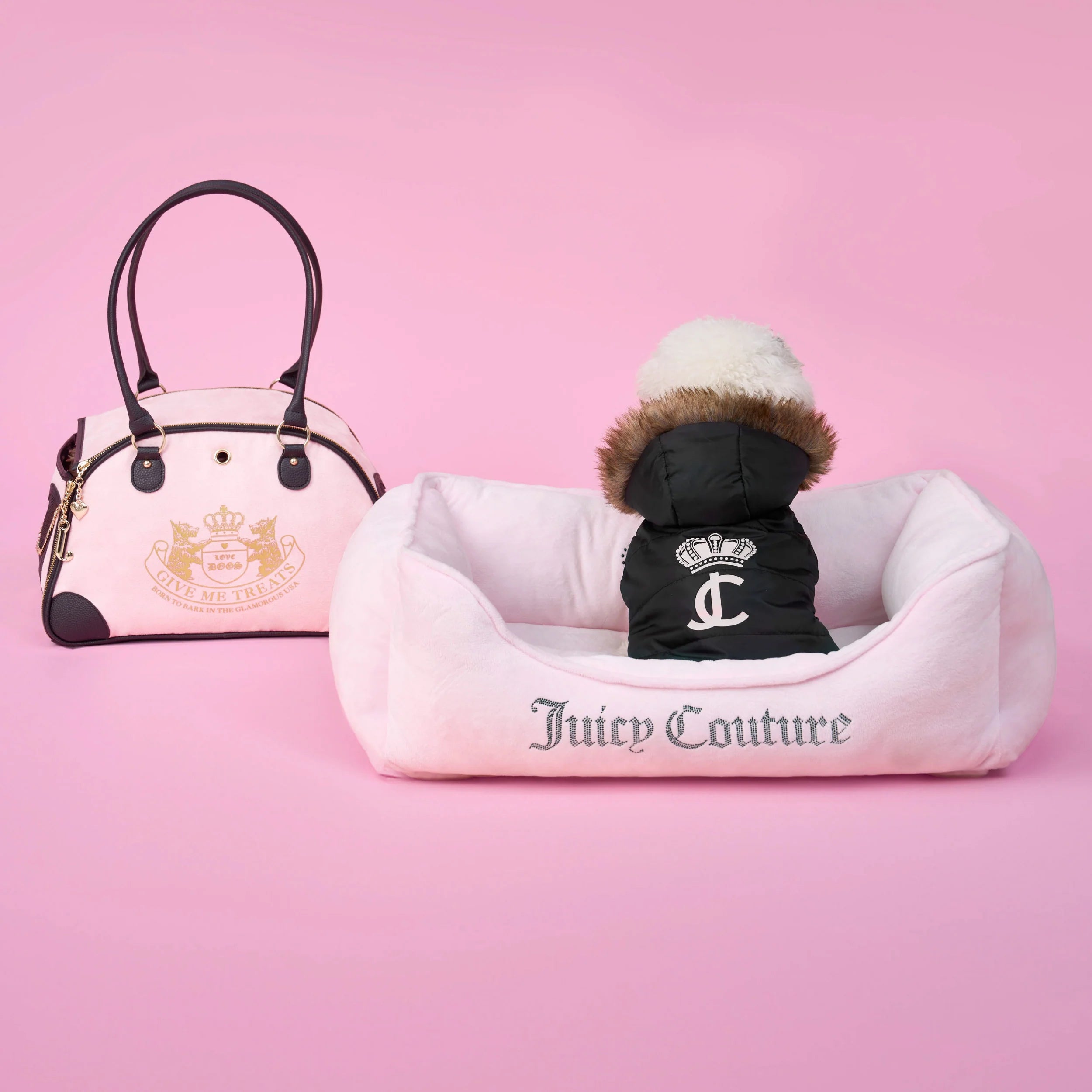 Elevate your pet's style and warmth with the Juicy Couture Crown Puffer Hooded Pet Jacket. Designed by the LA lifestyle brand known for casual glamour, this pet jacket embodies their unique spirit. Keep your furry friend cozy during cold weather with the faux fur hood while ensuring easy on-and-off convenience. Whether you're looking for dog cold-weather gear or fashionable pet attire, this hooded pet outfit has got you covered. Embrace winter in style, and let your pet enjoy a touch of couture in their everyday adventures.