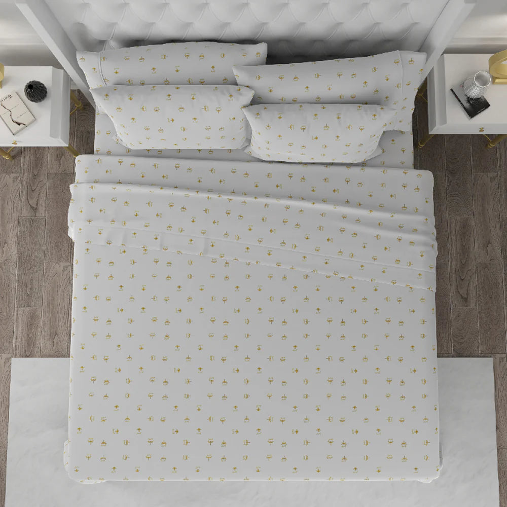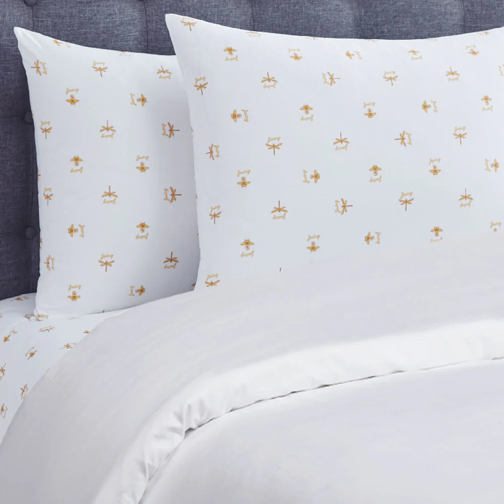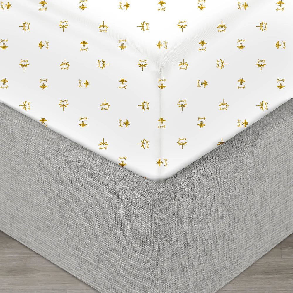 Effortlessly bring the chic and fun style of Juicy Couture to your home with the Queen Bee Microfiber Sheet Sets. Decadently soft, these sheets come in a variety of prints to add depth to your room decor. The Queen Bee print features the Juicy logo with dragonflies and bees in eye-catching gold over white.