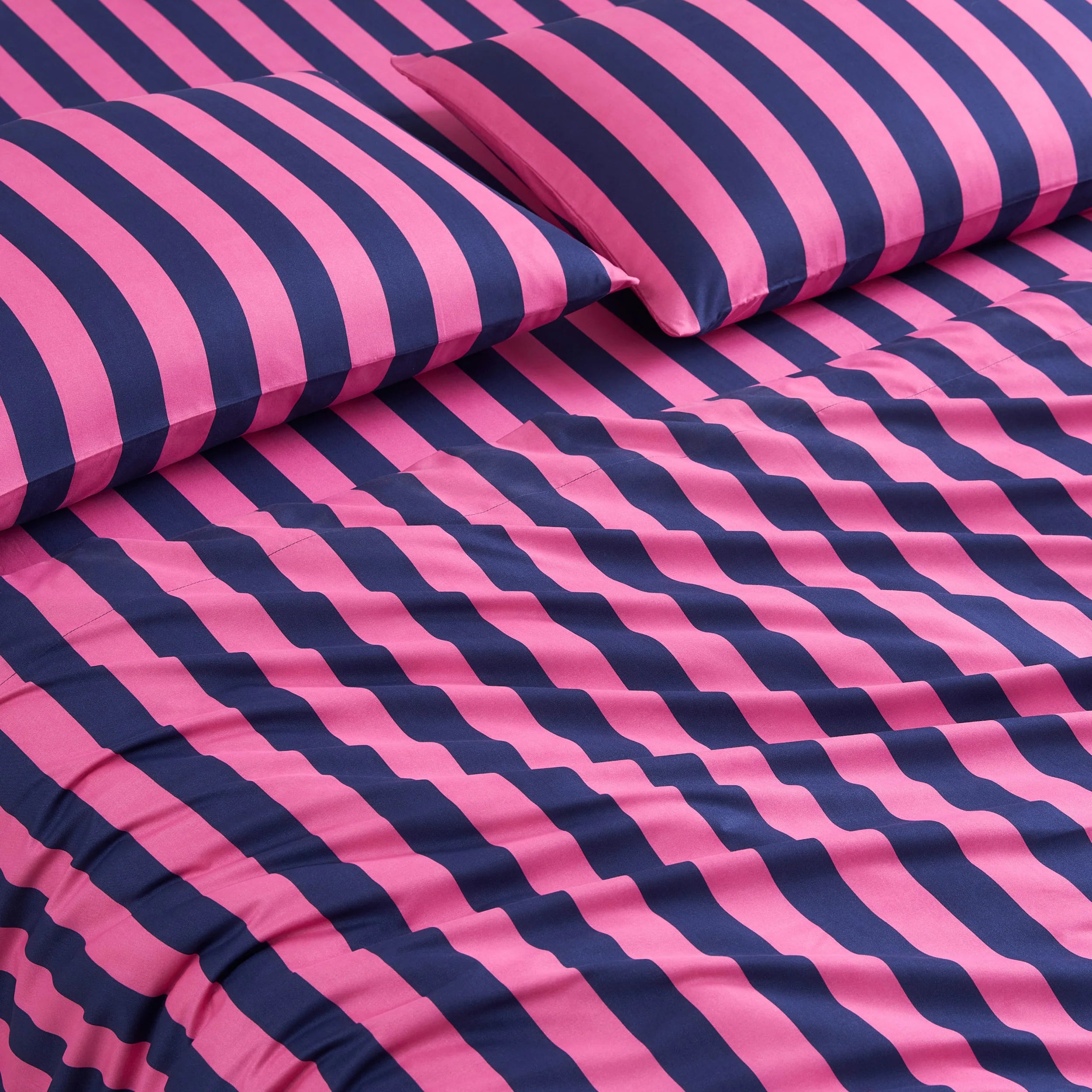 All your bedding needs in one glam package. This glamorous bedding set comes with everything you need for a luxurious sleep, including sheets, shams, pillowcases, a comforter and a stylish throw pillow. Features a reversable comforter to suit your ever mood.