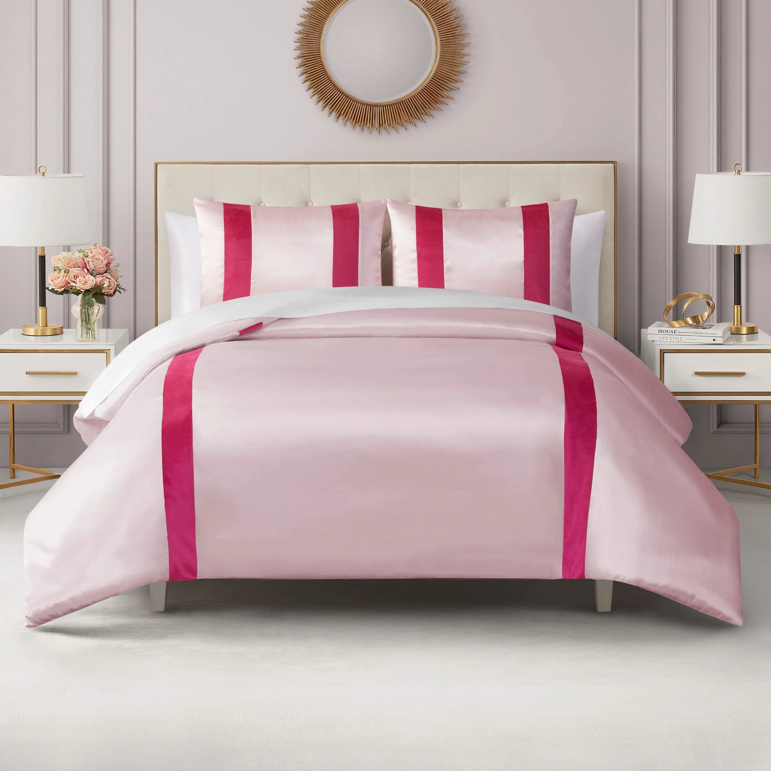 Turn any bedroom into a 5-star luxury hotel room with this sophisticated bedding set. This luxurious comforter and sham set combines smooth & lustrous satin with rich velvet stripes for a sophisticated yet soft vibe. Ready to give your space a high-end makeover?