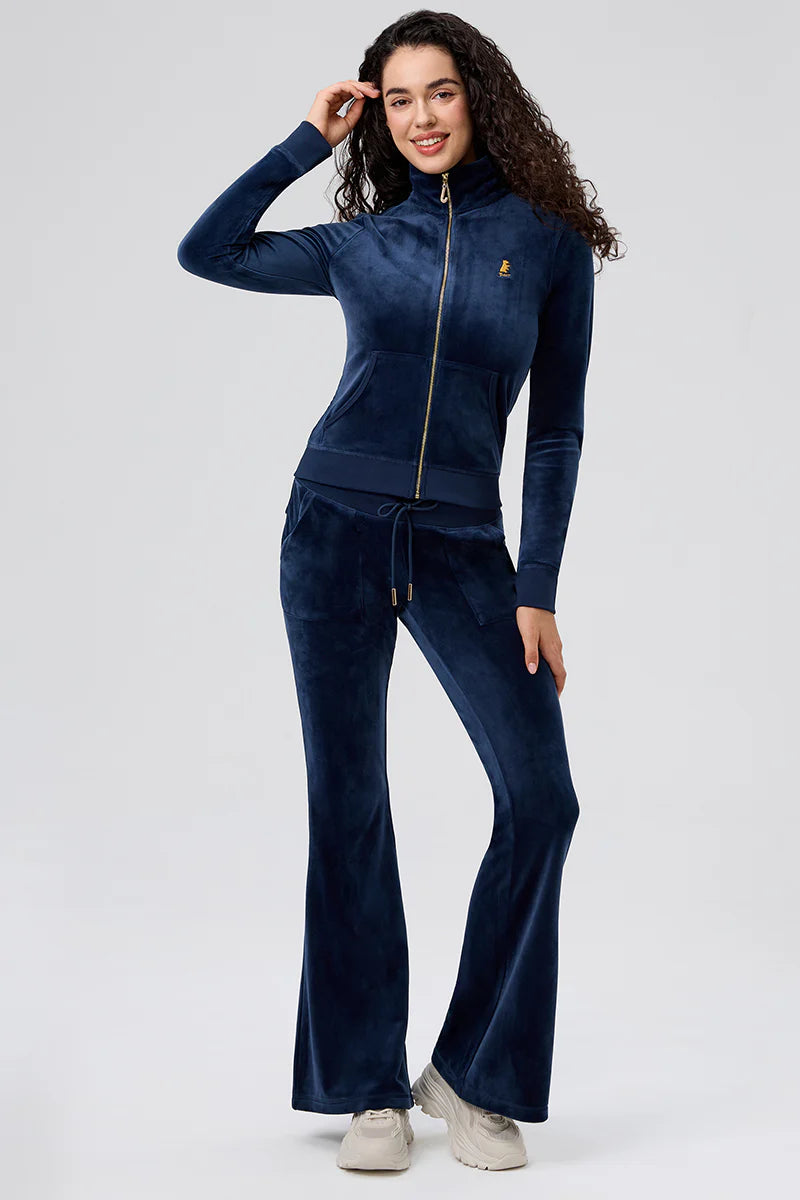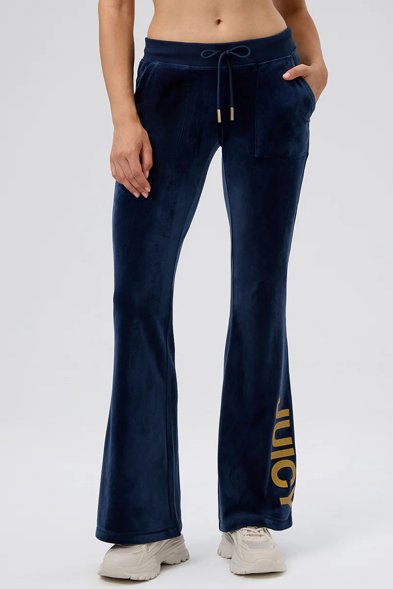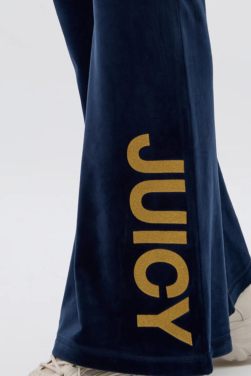 Where iconic comfort meets birthday sparkle. Designed in luxe velour with snap-back pockets for a touch of edge, this glam classic features a glittery “Juicy Couture” graphic down the leg. It’s the perfect mix of cozy and celebratory.