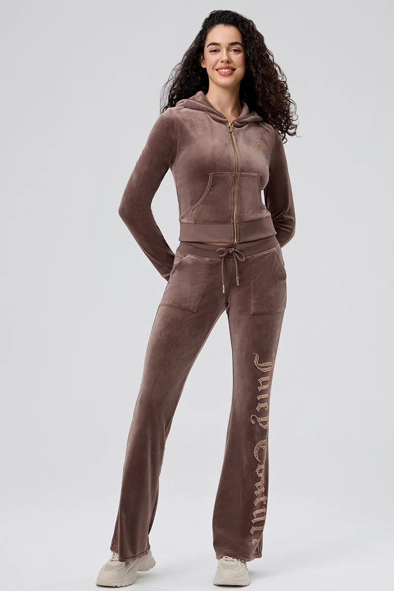 The ultimate throw-on-and-glow piece. Featuring a glittery back graphic with a bold “J” and the iconic phrase “Thirty, Flirty and Juicy,” this velour classic is finished with a rhinestone J zip puller for that extra sparkle.