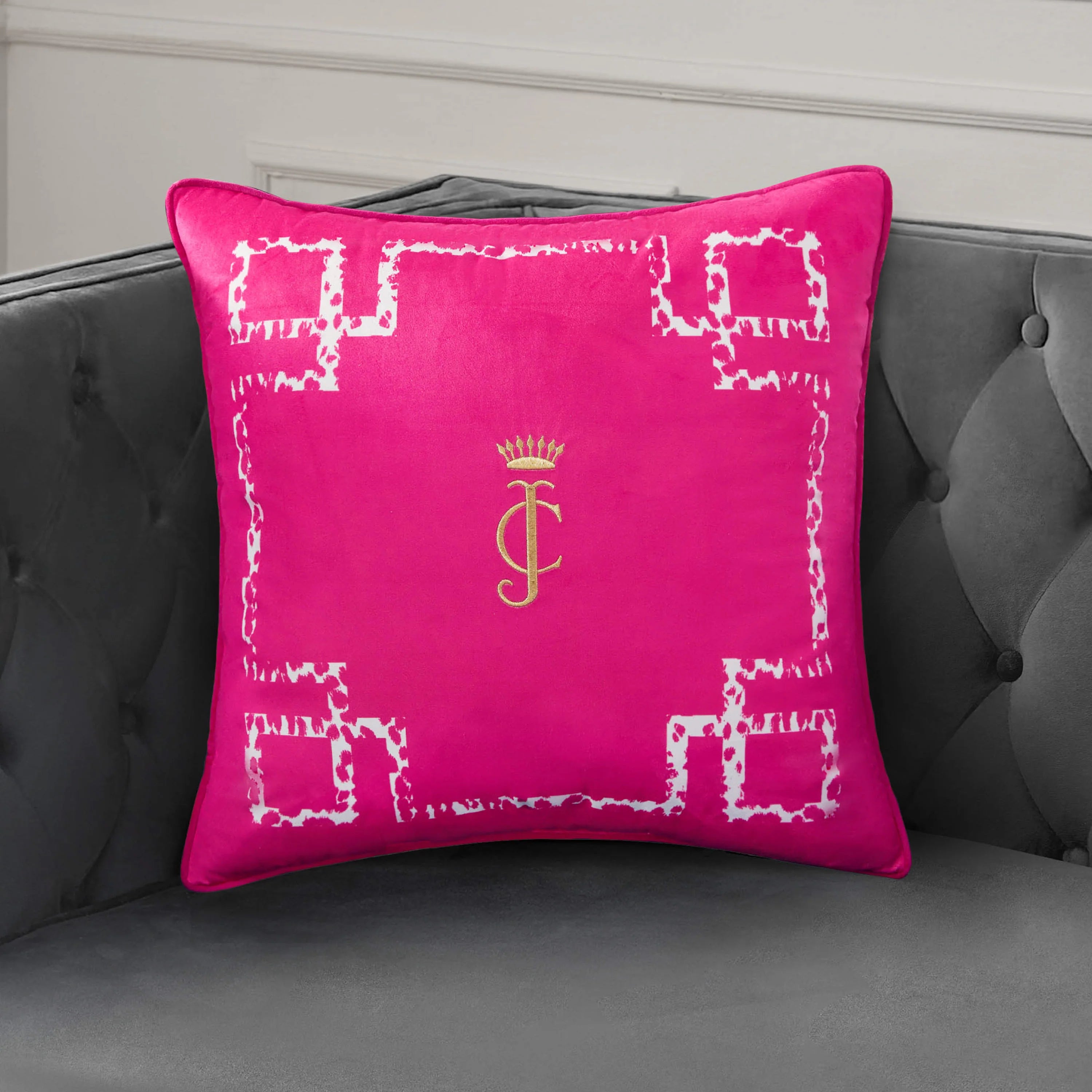 The sophisticated Juicy Couture Lattice Embroidered Velvet Throw Pillow will elevate any part of your home. This rich black pillow features a chic monochrome cheetah print lattice border, showcasing a regal JC logo embroidered in gold thread.
