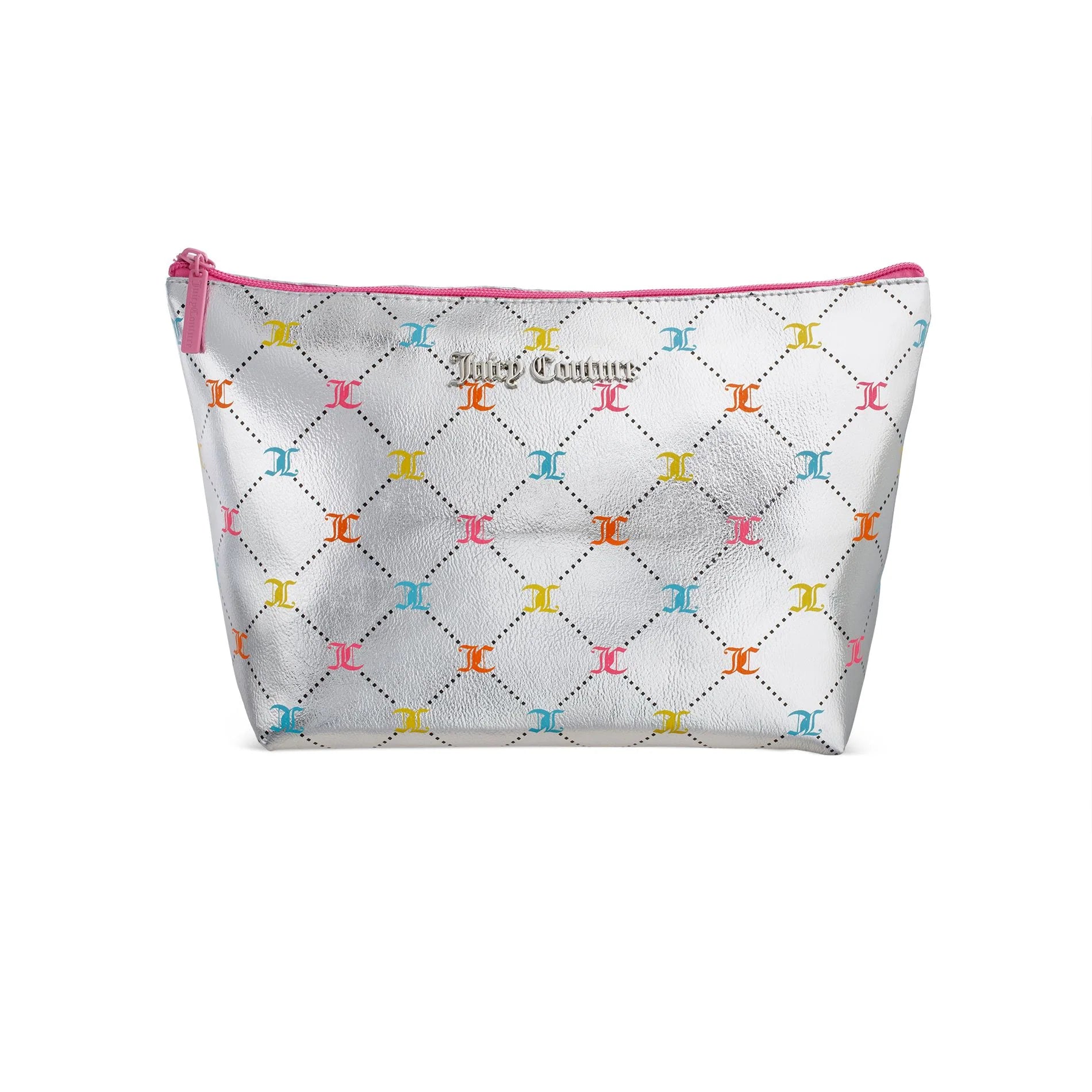 Our Juicy Couture lattice logo print on metallic silver vegan leather top zip cosmetic bag will have...