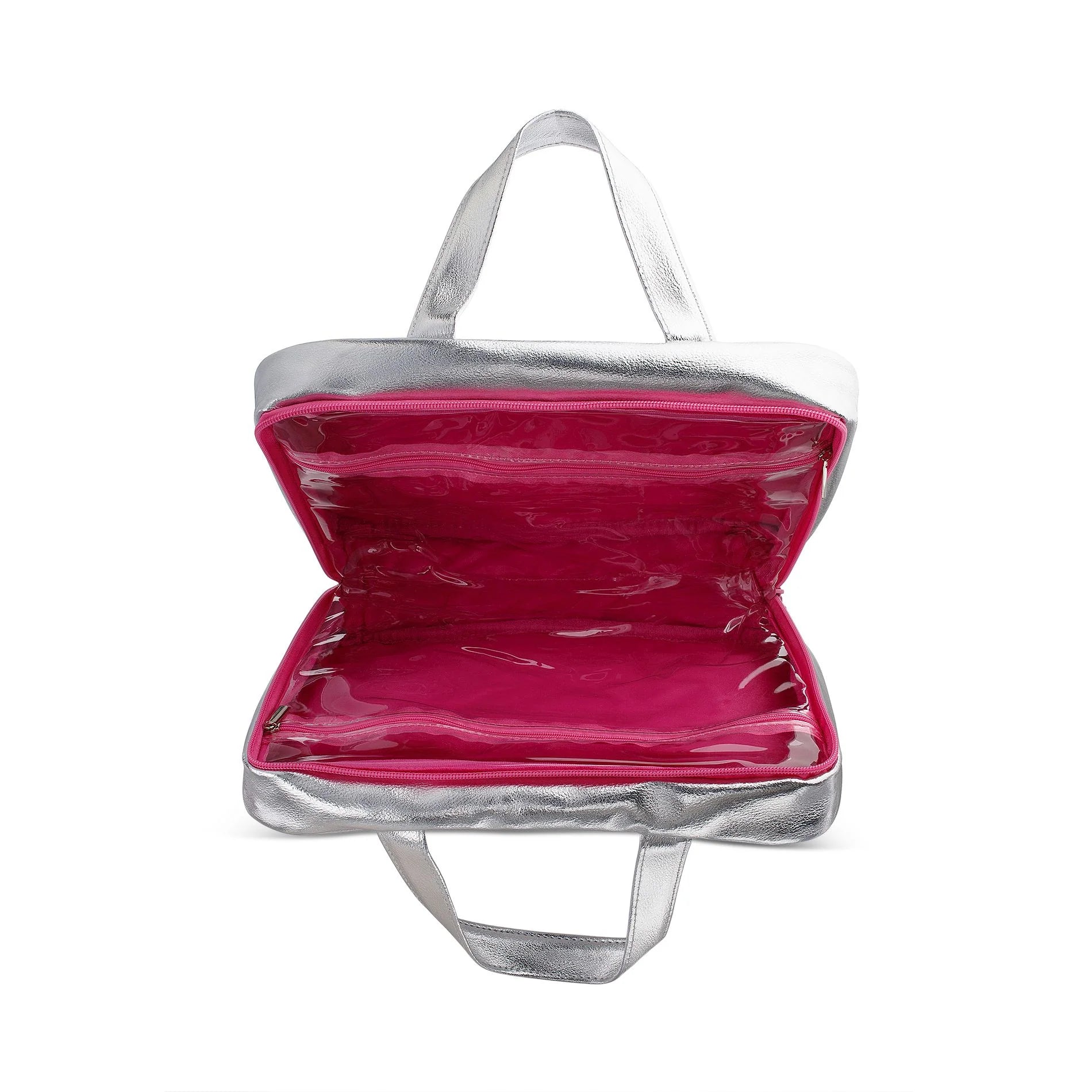Pack all your essential beauty products with our Juicy Couture lattice logo print metallic silver weekender. With two zippable compartments, it's the perfect companion for holding your beauty must-haves for any on-the-go adventure.