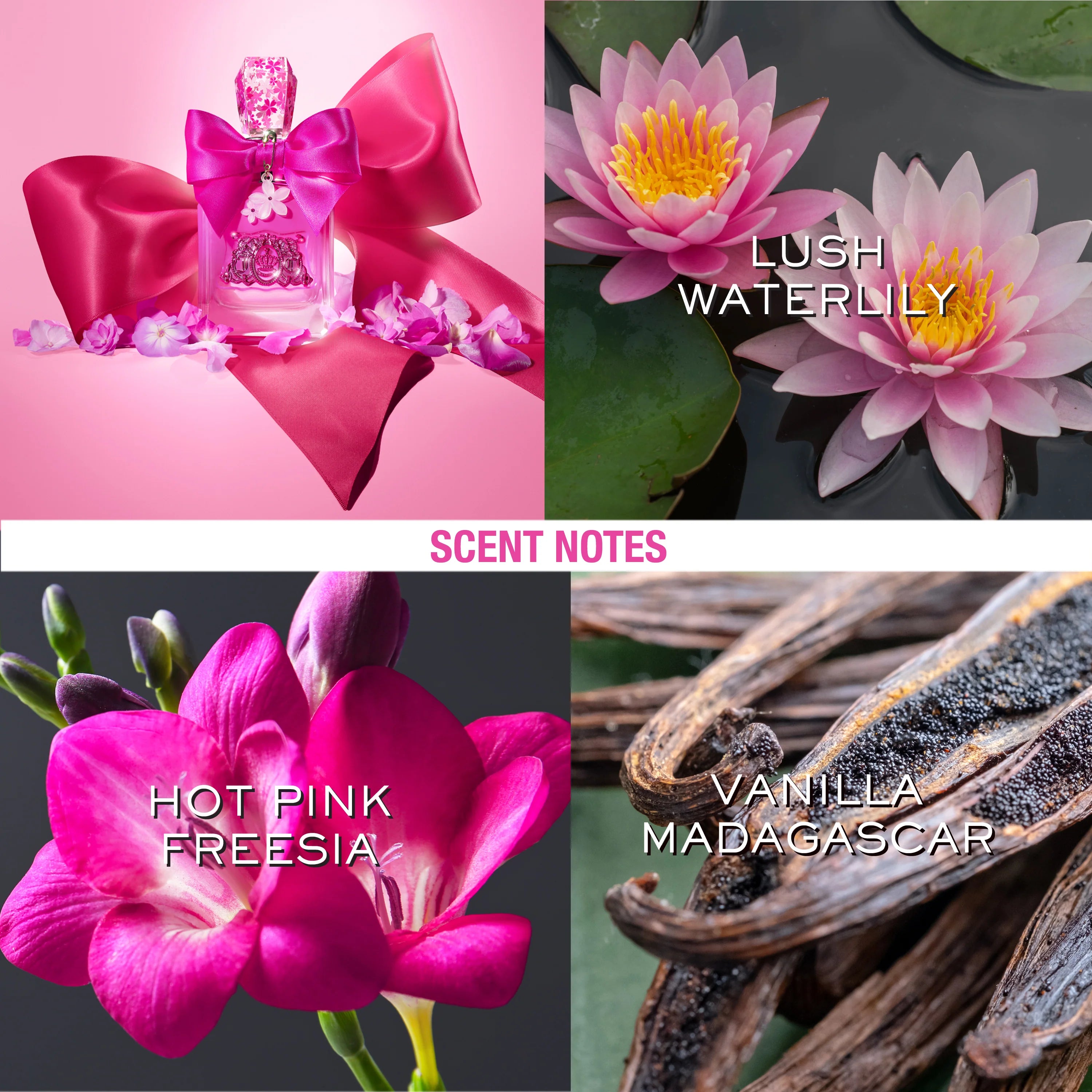 Viva La Juicy Petals Please is a Lush, Floral Fruity scent with Water Lily, Hot Pink Freesia and Vanilla Madagascar. Emboldened by the power of the petal and full of wonder - embrace your vibrance, add your color, choose joy & bloom on! Viva La Juicy Petals Please bursts with a Sparkling Pink Floralcy of Fresh Magnolia Blossom drenched in Lush Water Lily before blooming into a vibrant, petally bouquet of Wild Jasmine & Hot Pink Freesia. This colorful creation unwinds into a wildly indulgent scent of Caramelized Woods & Golden Ambers, wrapped in Vanilla Madagascar that blooms off the skin leaving a lush and intoxicating signature. The Viva La Juicy Petals Please bottle is in full bloom, bursting with wild hues of pink and adorned with petals. The iconic Viva La Juicy bottle has embraced its vibrance & is now hot pink! The beautiful glass heel of the bottle is intentionally left bare to embody that sense of wonder. The bottle features a metallic pink plaque and satin bow with a frosted flower charm with pink stones at the center. The crystal cap is now infused with flowers in different shades of pink for that over-the-top petals moment!
